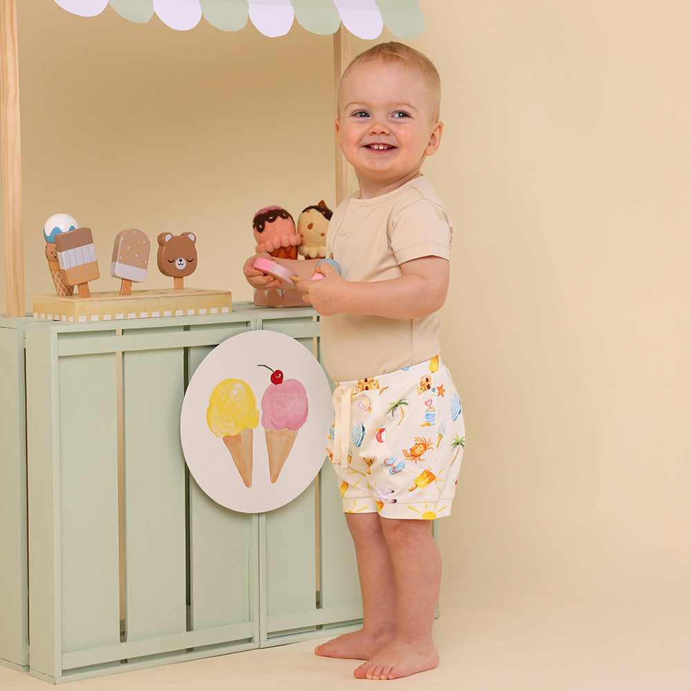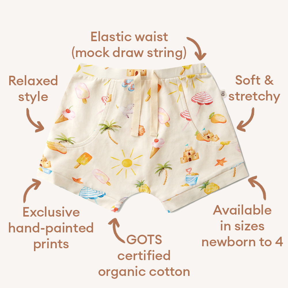 Snuggle Hunny organic Beach Fun shorts are made for babies and toddlers. They are practical whilst being very stylish and match beautifully with our fitted bodysuits and T-Shirts.