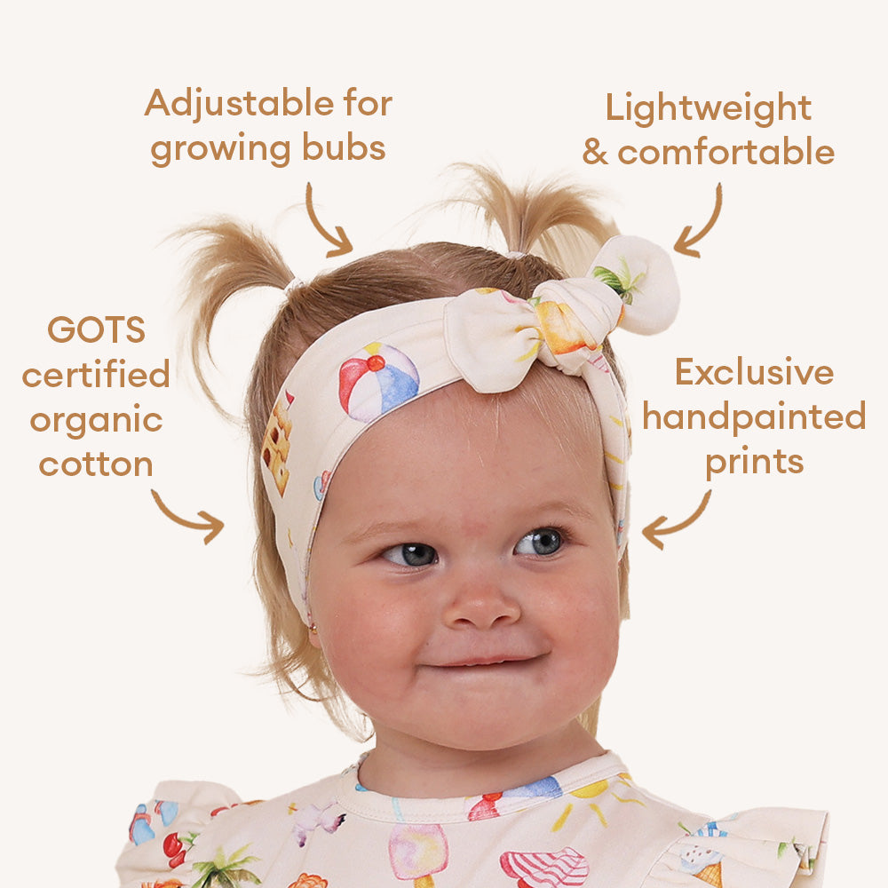 Our Snuggle Hunny organic cotton jersey topknot is soft and snuggly. This topknot features our Beach Fun design and is made with Certified Organic cotton.