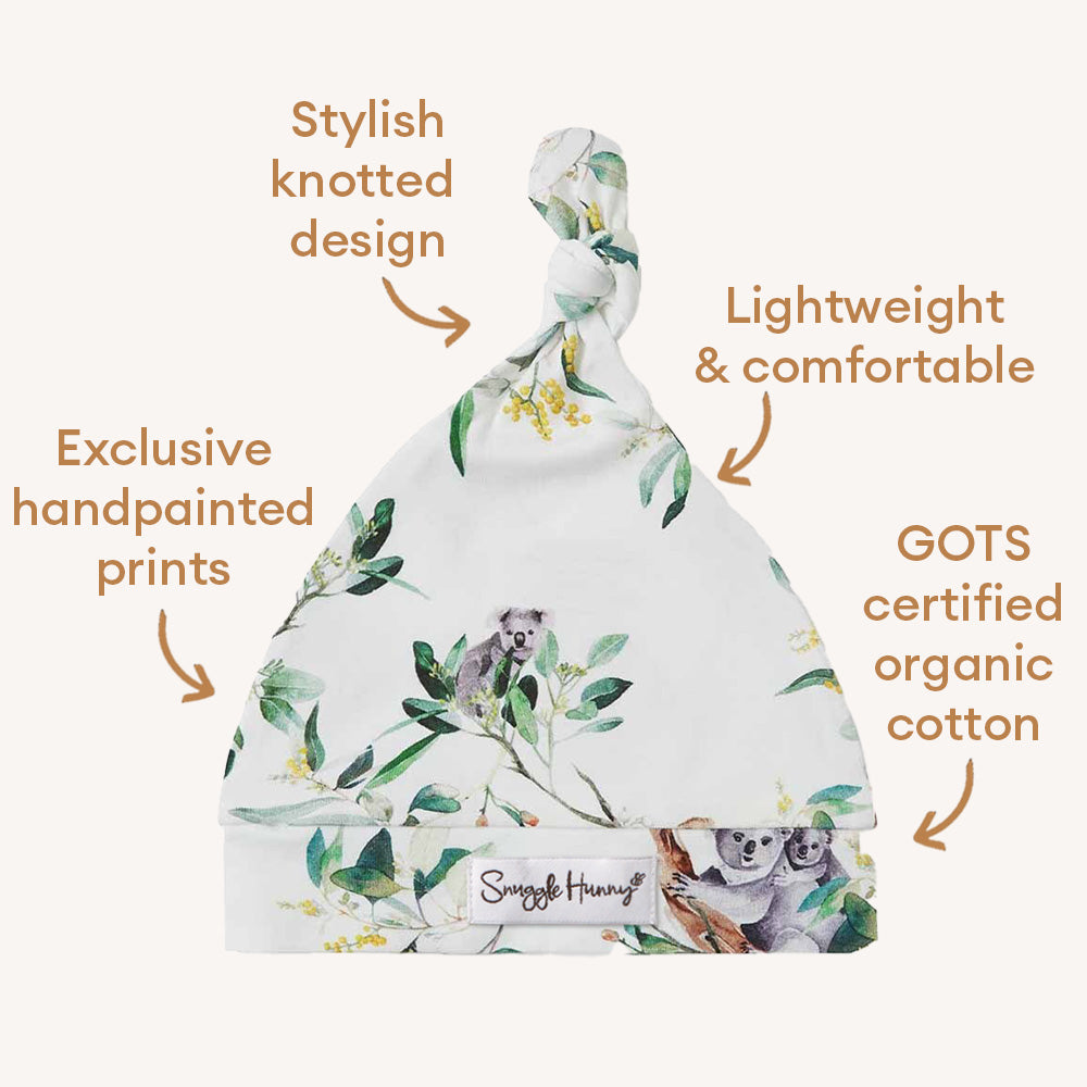 Our Snuggle Hunny Eucalypt knotted baby beanie is soft and snuggly and made with Certified Organic cotton so you know bub has only the best. For newborns to 6 months old.