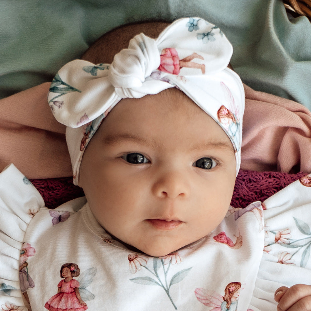 Our Snuggle Hunny organic cotton jersey topknot is soft and snuggly. This topknot features our Fairy Garden design and is made with Certified Organic cotton.