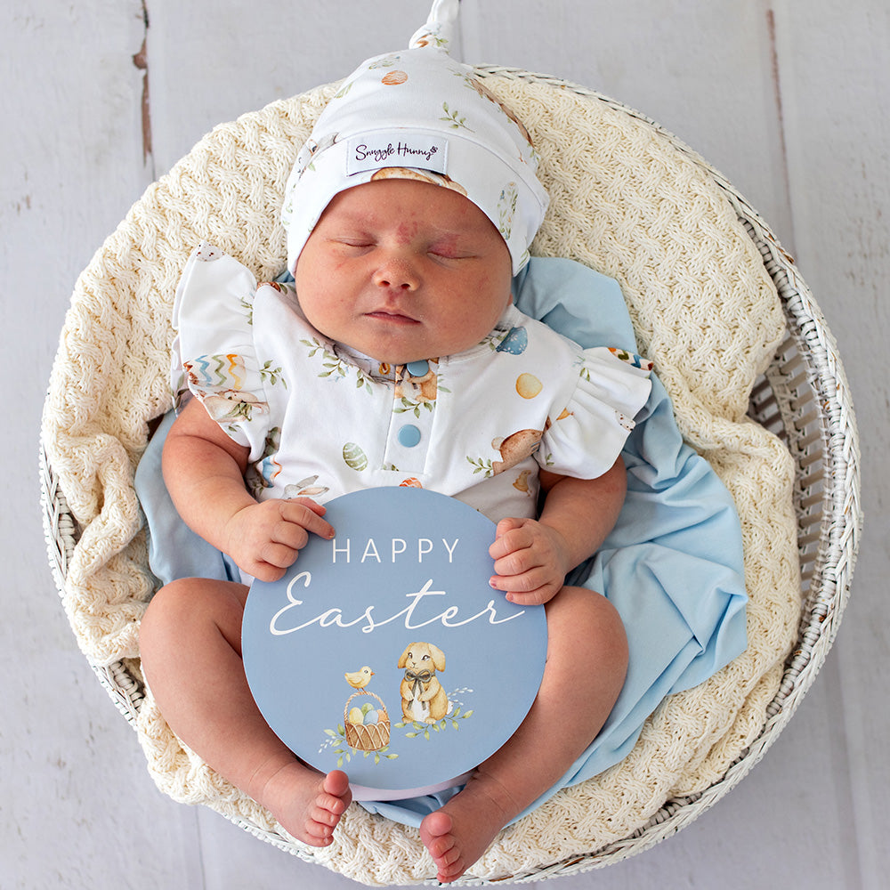 Perfect for baby's first Easter, our Flopsy Bunnies Milestone card features My First Easter on one side and Happy Easter on the other. Pair with our jersey wrap or organic clothing for a beautiful Easter outfit.