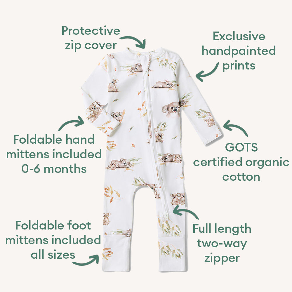 This design includes a two way zip, making it easy to get bub in and out for naptime and nappy change. Foldable hand mittens are included for newborn to 6 months and help stop little nails from scratching and also keep hands warm when the weather is cool. Bub can wear the mittens open or closed. For sizes from 6 months upwards, the mittens are replaced with a stylish cuff. Foot mittens are also an important feature and these are included on all sizes. Who doesn’t love to tuck in those little feet for bedtime to keep warm?